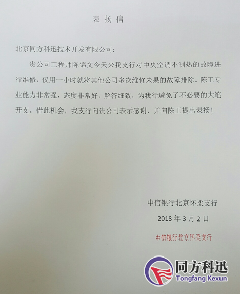 3月2日,中信銀行北京懷柔支行為我公司寄來一封表揚信,對我公司及工作人員的服務(wù)表示高度贊揚,并且當場熱切表示將我公司作為其空調(diào)維保服務(wù)唯一指定公司!